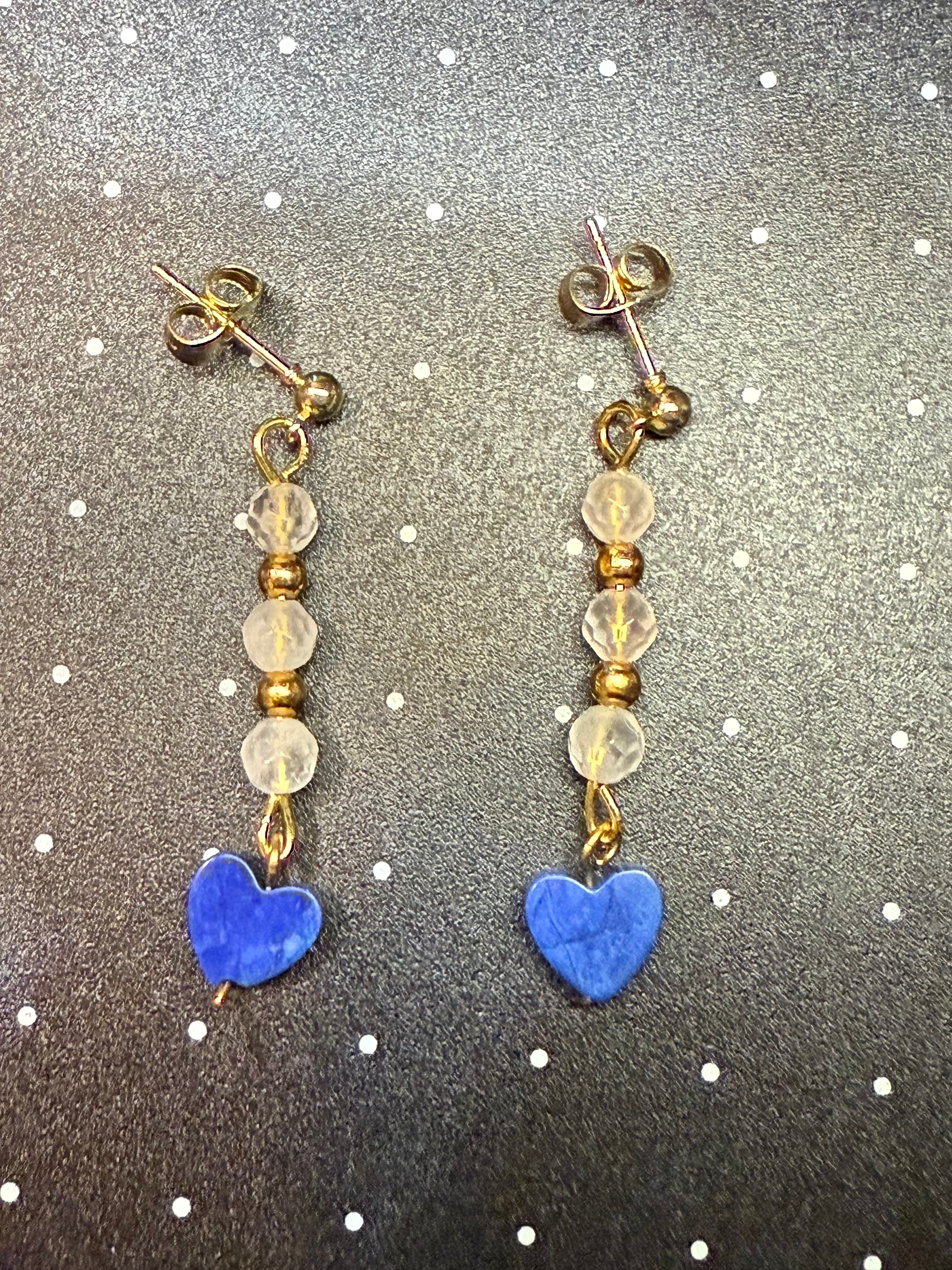 ラピスラズリピアスは、深い青色に金色のスパークが輝く神秘的な宝石、ラピスラズリを使用したハンドメイドのアイテムです。一つひとつ丁寧に仕上げられたこのピアスは、シンプルながらも存在感があり、シーンを選ばず活躍します。特に、カジュアルな日常使いや特別な日の装いに最適なアクセサリーです。クリエイティブなデザインにより、動くたびに耳元で軽やかに揺れる様子が、とても優雅で洗練された印象を与えます。ラピスラズリの持つパワーを楽しみながら、自分らしさを引き立てる一本となっています。