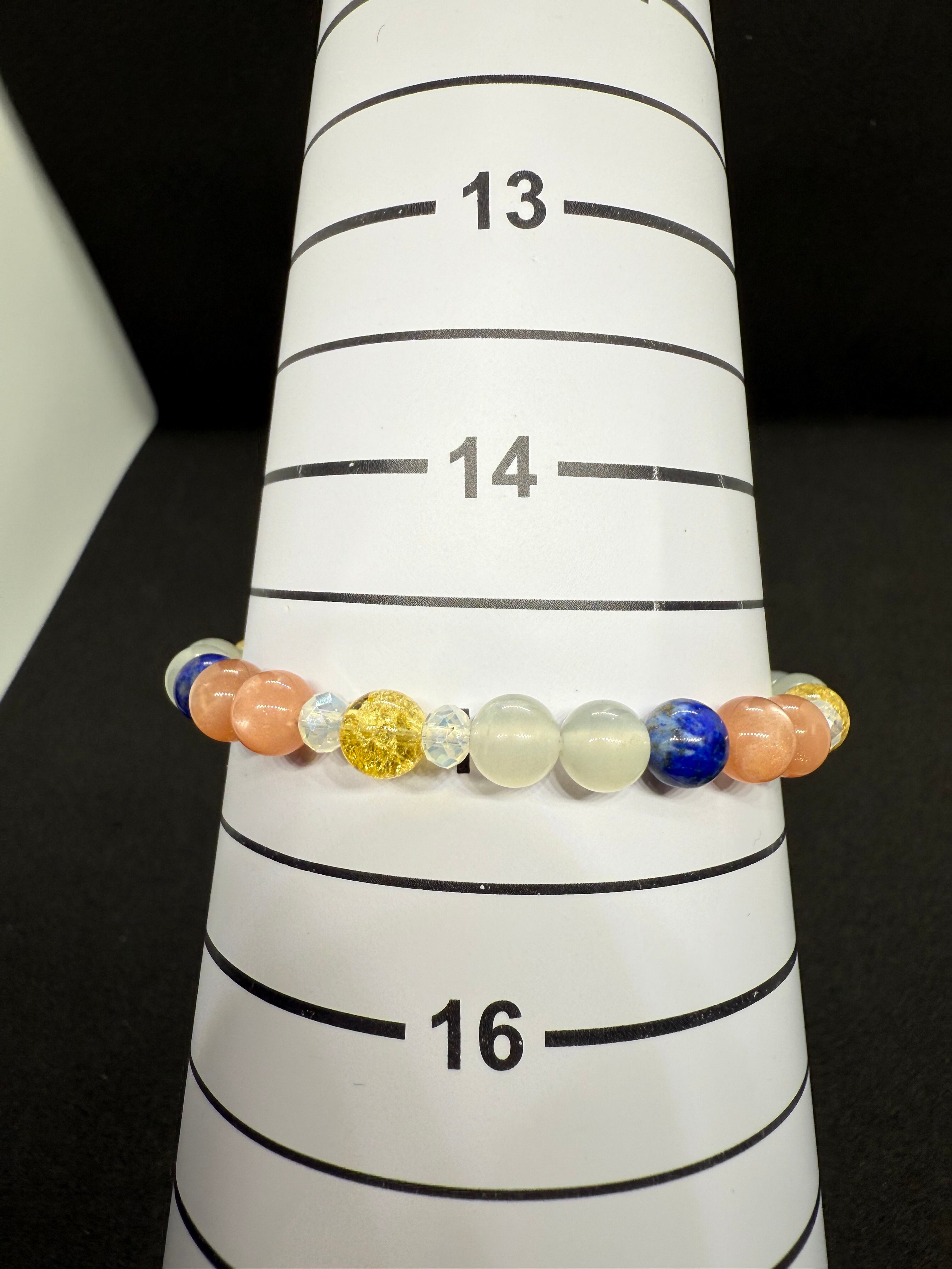 このブレスレットは、月と太陽、そしてその間に広がる空と星をイメージした美しいデザインが特徴です。天然石を使い、手作業で心を込めて仕上げられた特別なアイテムです。月と太陽のモチーフが織りなす調和が、あなたの手元に優雅で神秘的な印象を与えてくれます。