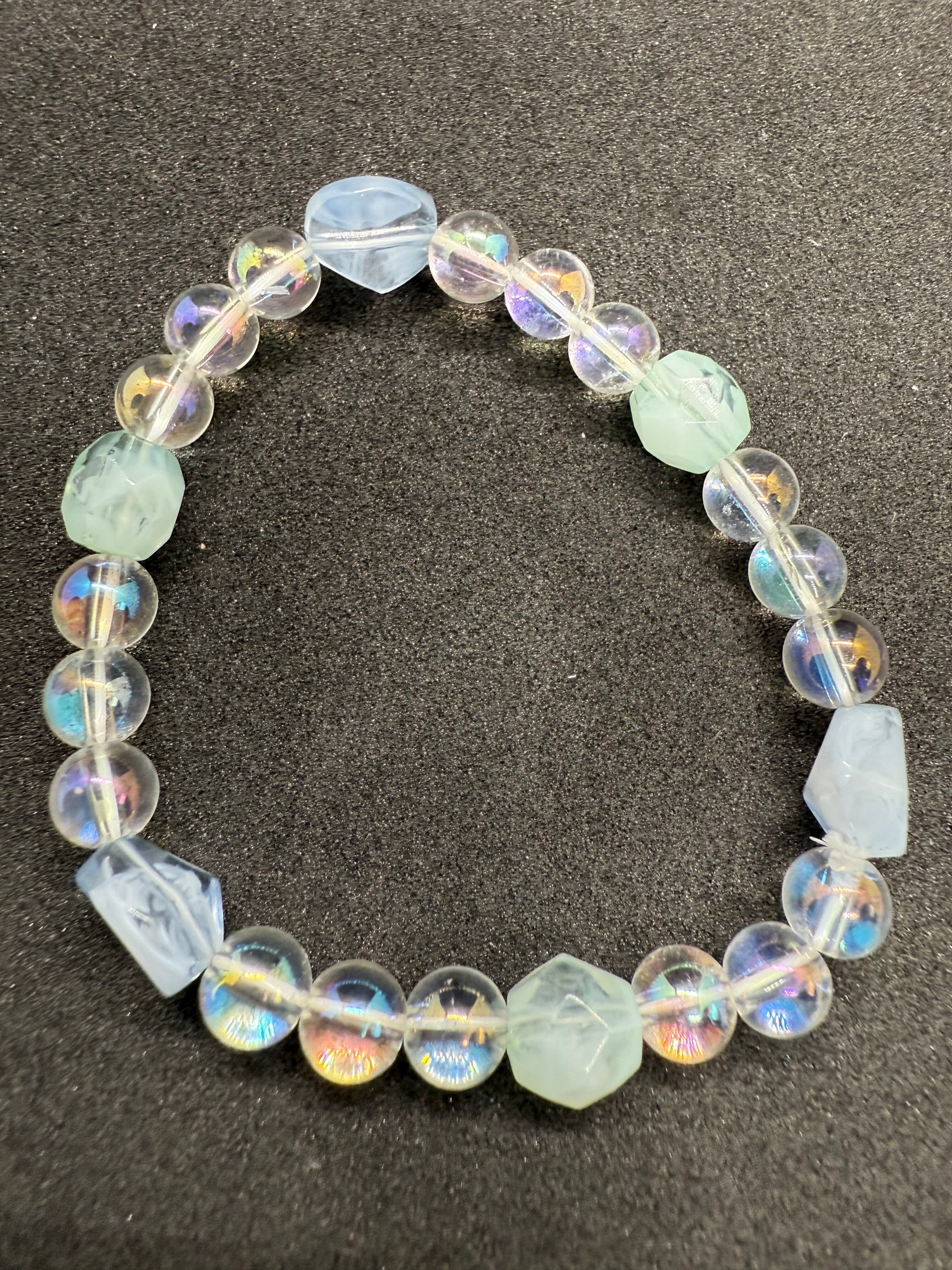 このブレスレットは、海と泡をテーマにした華やかなデザインが特徴です。オーロラ水晶とカラフルなプラスチックビーズを使用し、手作業で丁寧に仕上げられた特別なアイテムです。光を受けて輝くオーロラ水晶が、まるで海の中で遊ぶ泡のように、あなたの手元を美しく彩ります。