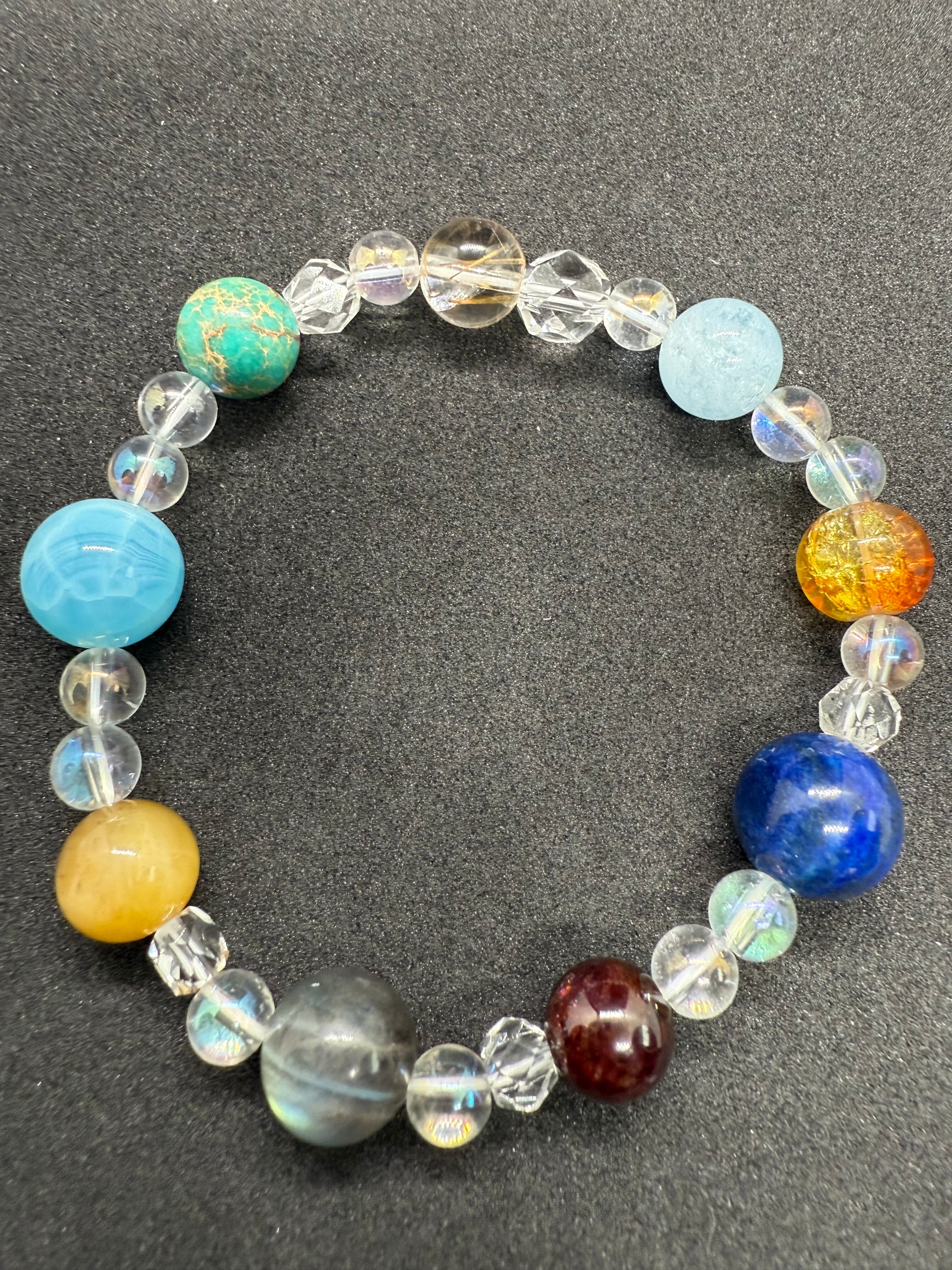 このブレスレットは、惑星シリーズの大きめサイズが特徴です。天然石を使用し、一つ一つ丁寧にハンドメイドで仕上げられた特別なアイテムです。大惑星の存在感が、あなたの手元をダイナミックに彩ります。