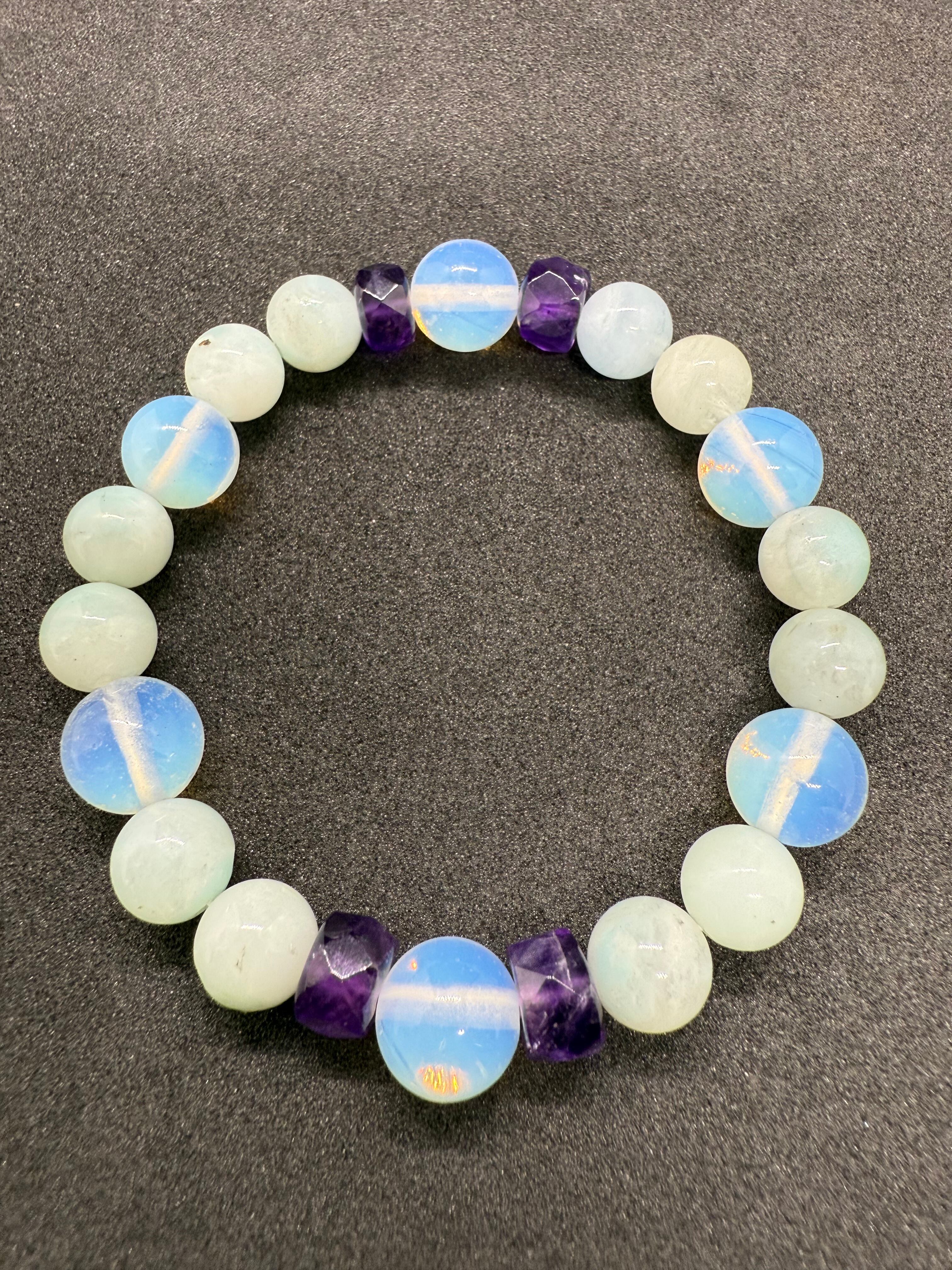 この天然石ブレスレットは、クリアな水晶とアメジストを贅沢に使用した特別なアイテムです。水面に浮かぶバブルのような輝きが手元を美しく彩り、洗練されたデザインがあなたの魅力を引き立てます。日常のコーディネートに個性的な煌めきを添え、おしゃれを楽しむ毎日を演出します。