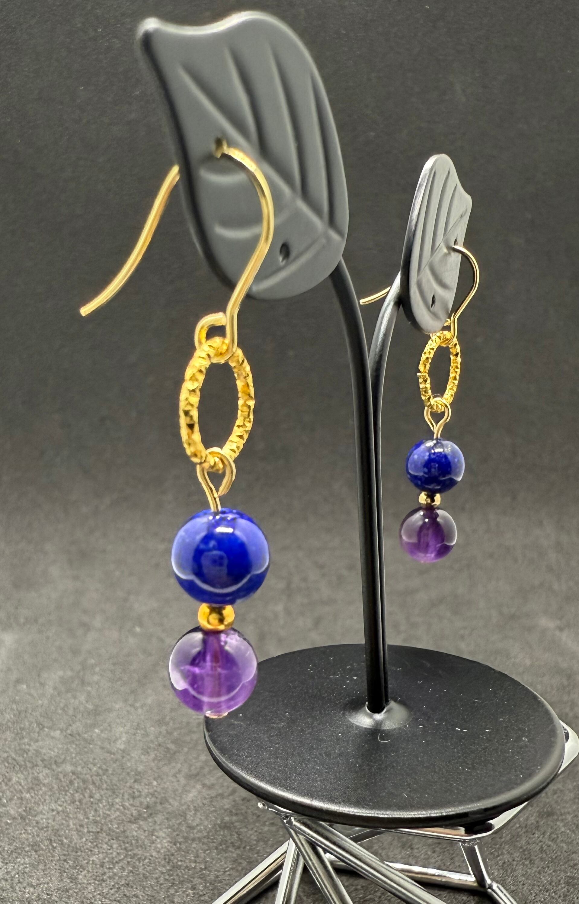 素材:天然石を使用した、ハンドメイドのラピスラズリとアメジストのビーズピアス