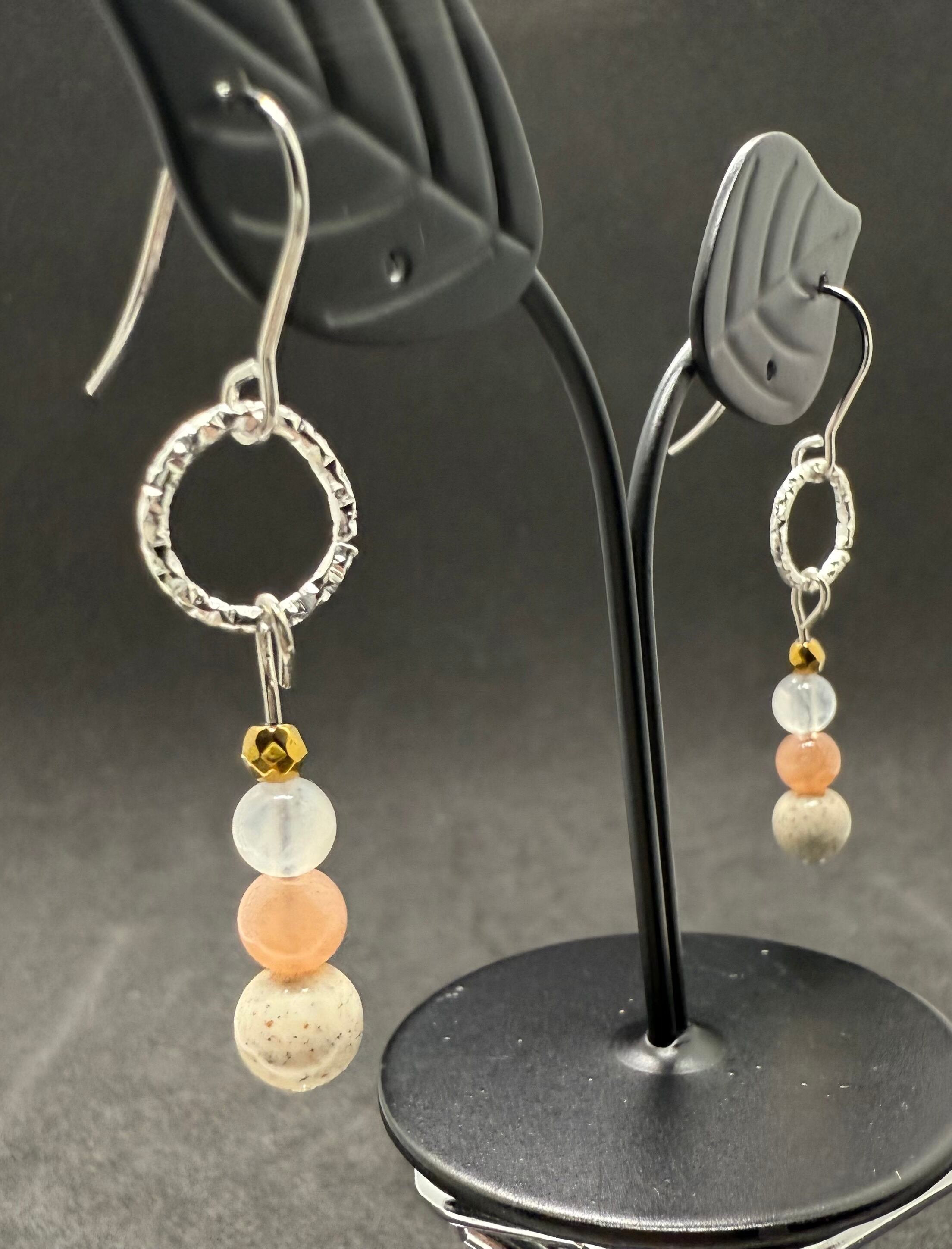素材:天然石を使用した、ハンドメイドのサンストーンとムーンストーンのビーズピアス