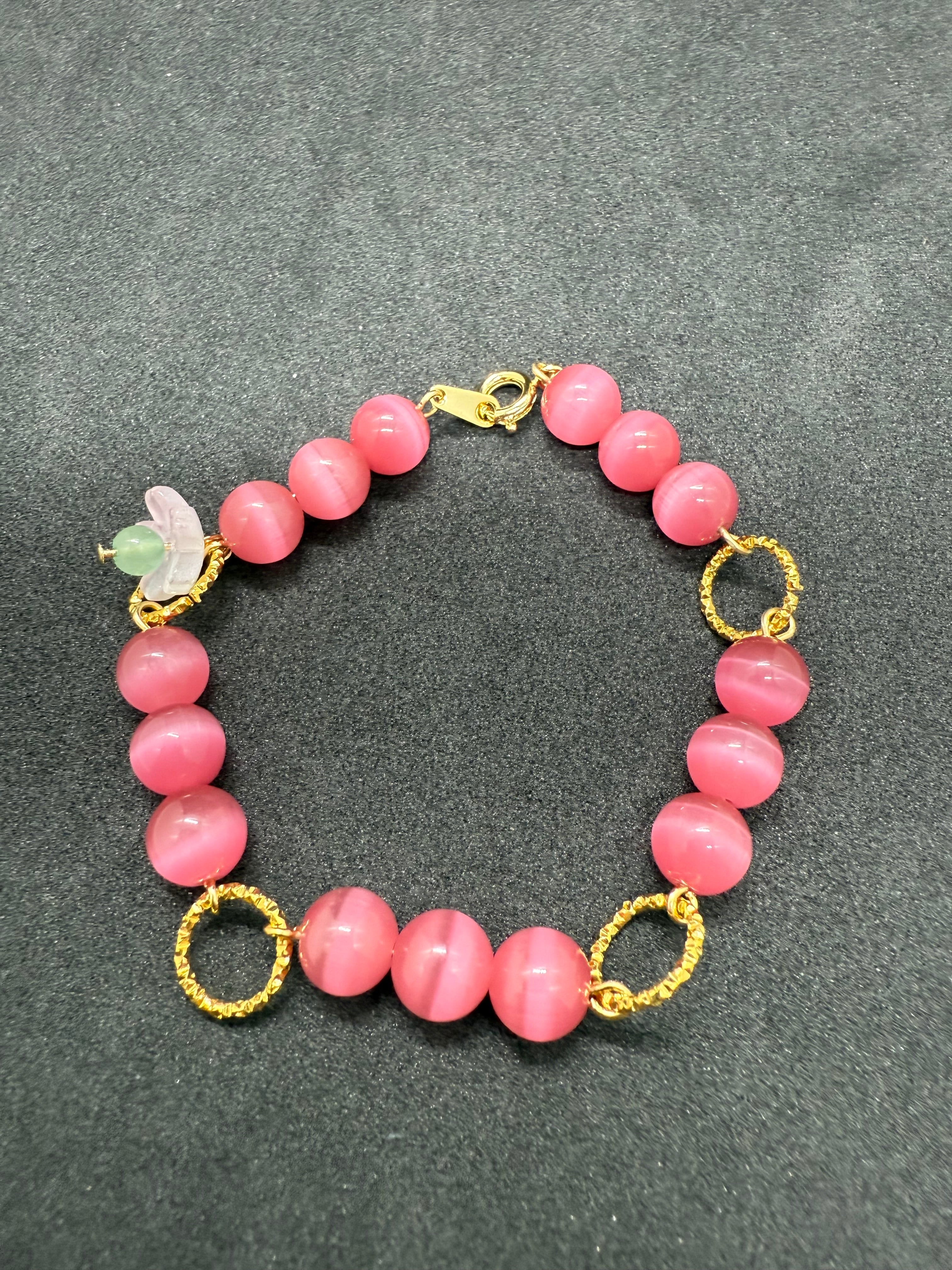 素材:魅力的なピンクキャッツアイを使用したエレガントなリングブレスレット