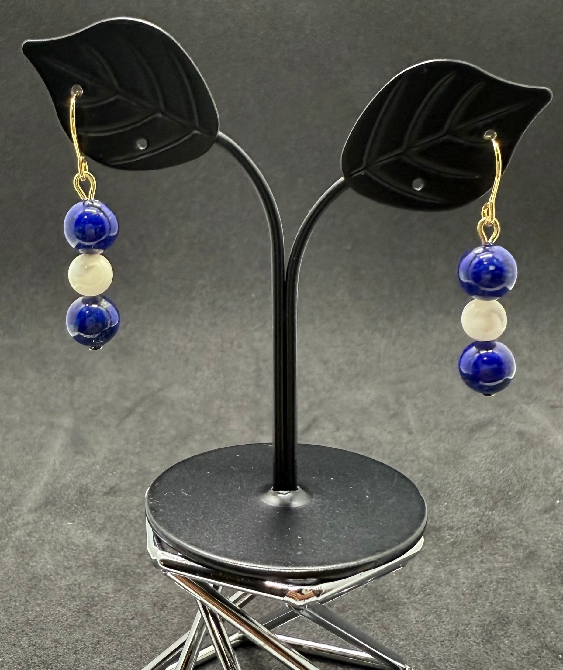 素材:深い青色のラピスラズリと、優雅なマザーオブパールを使用した魅力的なピアスです。