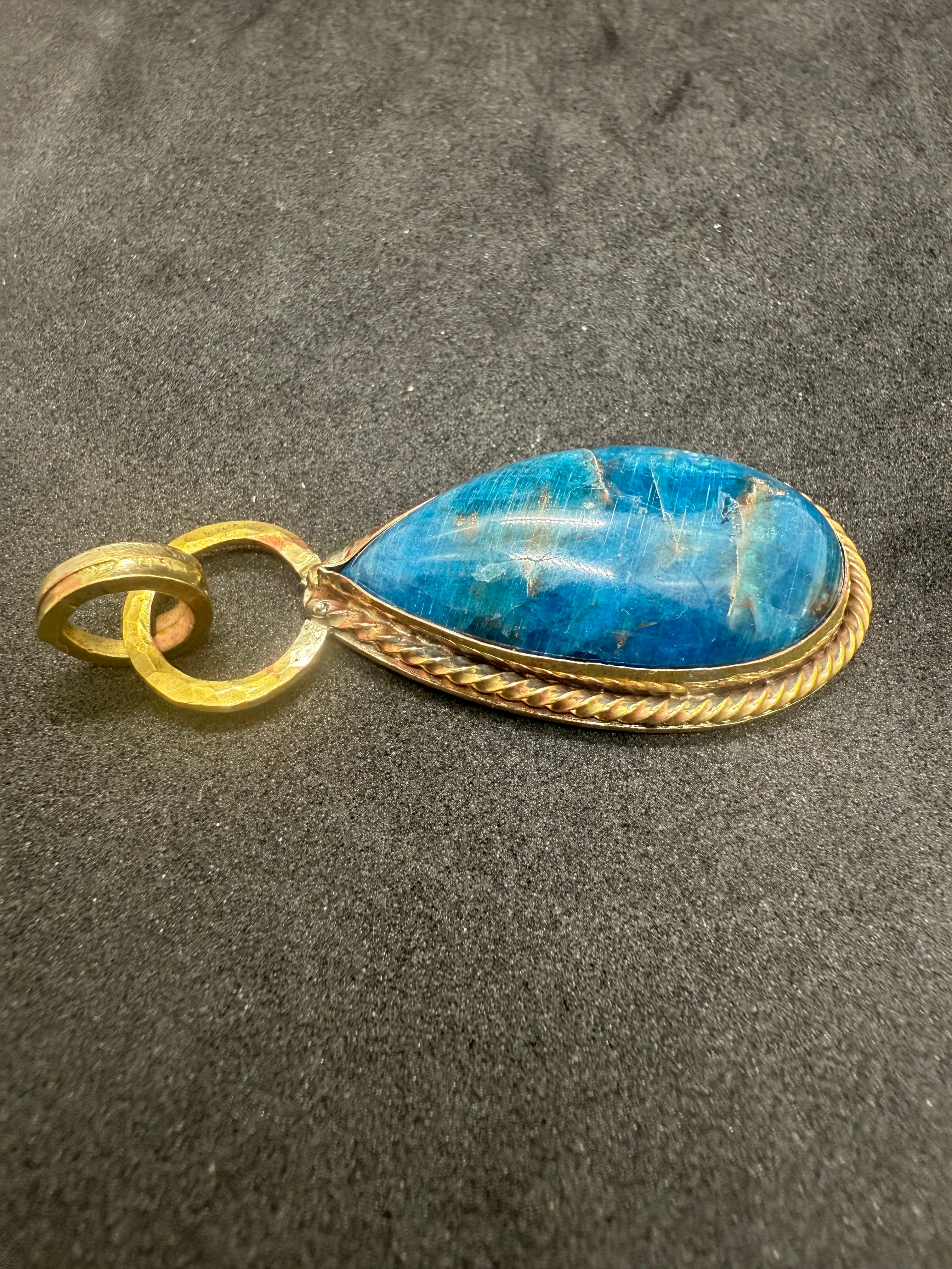 デザイン:店主が原石からカット・研磨・彫金して製作した「アパタイト ペンダントトップ・ドロップ型」は、鮮やかな青色が特徴的で、シンプルながらも存在感のあるデザインが魅力です。このペンダントは、日常のファッションに少しのアクセントを加えたり、特別な日のおしゃれのスパイスとしても大活躍します。アパタイトが持つ明るいエネルギーを感じながら、このアイテムを身に着けることで、毎日をより輝かしいものにするお手伝いをいたします。手作りの温もりを感じながら、自分自身のスタイルを楽しむ素敵なお供になれば嬉しいです。